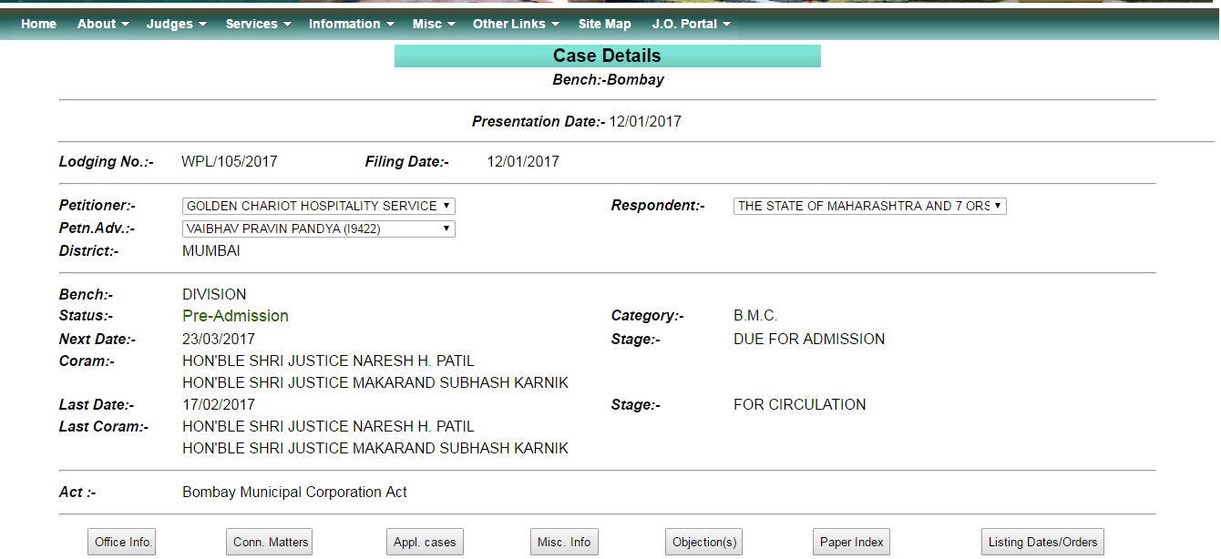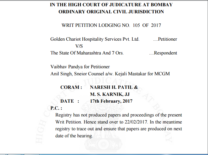Basically in the writ petition (105/2017) filed by the Golden Chariot Hospitality Services Private Limited against the state government, the rule is yet to be granted. When the petition came up for hearing for the first time, a bench comprising justices Naresh Patil and M.S.Karnik observed that, “Registry has not produced papers and proceedings of the present writ petition. Hence it stand over to 22 February 2017. In the meantime registry to trace out and ensure that papers are produced on next date of the hearing. Now the petition is to scheduled to come up for hearing on23 March 2017.